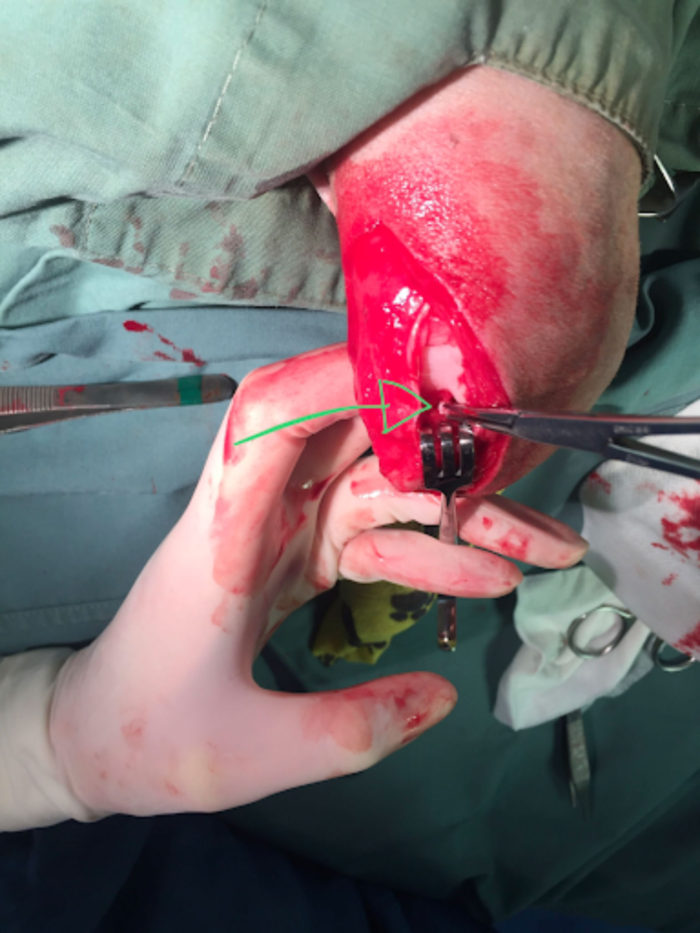 The picture above shows the torn CrCL visible during exploration of the stifle joint (arrow)