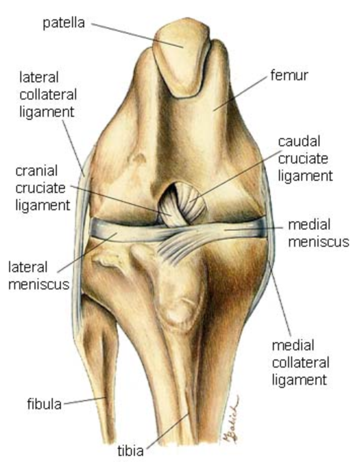 Anatomy of the stifle joint showing the cranial + caudal cruciate ligaments and meniscal cartilages
