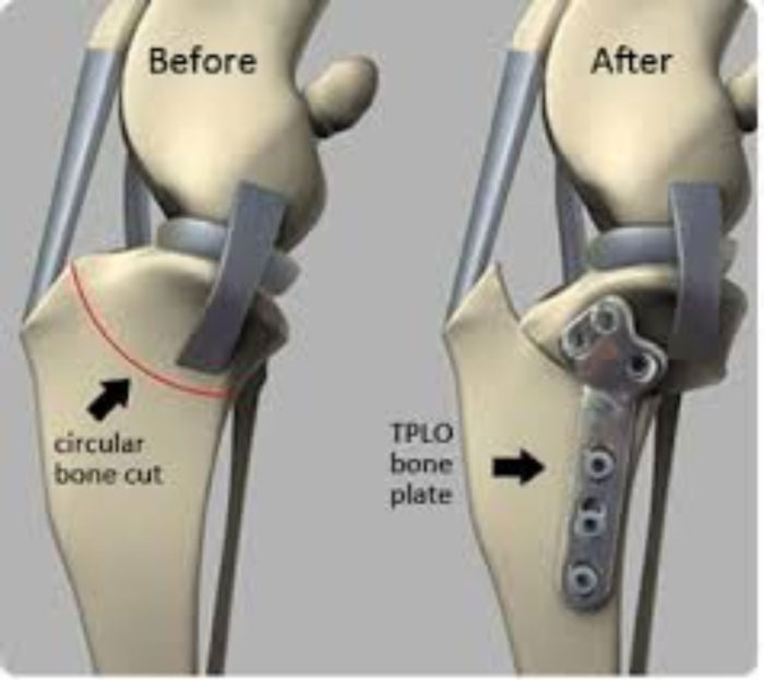 Tibial plateau- leveling osteotomy (TPLO):Is a surgical technique that changes the biomechanics of the stifle joint, eliminating the functional need of the CrCL. This is achieved by making a cut (osteotomy) in the proximal tibia (shin bone) and rotating the plateau to change the tibial plateau angle, thereby eliminating tibial thrust (physiological force that occurs with each step).