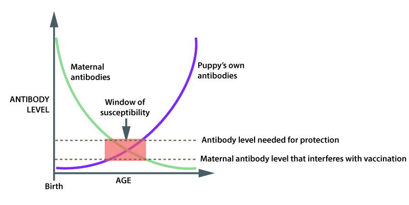 Young animals often get some protection in the form of antibodies from their mothers’ colostrum, and the exact amount we don’t know but it will wane somewhere between 8 and 16 weeks leaving them without protection and most susceptible to disease. As we don’t know how much antibody an infant has we vaccinate repeatedly to cover them in case it’s the 8 week mark, or around 12 weeks, or even 16 weeks when they enter their susceptible period. If we vaccinate them when they still have some antibodies from their mum then these antibodies will bind the vaccine and their immune system will not be activated to produce their own antibodies. If we vaccinate them twice in their window of susceptibility then that’s ok – they make antibodies to protect them against the disease! So the puppy that drank lots of colostrum might have antibodies to last him until 16 weeks and won’t actually respond until the last vaccination, but the runt that didn’t get much colostrum may respond, and need the 8 week vaccine to remain protected.